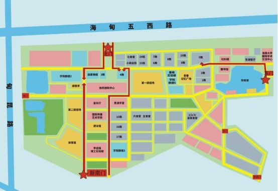 考试期间,海南大学海甸校区北门、东门及新南门均为考生开放,3、4号教学楼考场的考生建议从北门进校,5号教学楼考场的考生建议从东门进校。考生出示《准考证》即可步行入校。考生入校后可乘坐校内摆渡车。