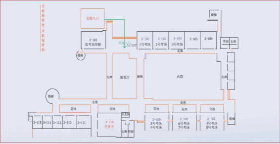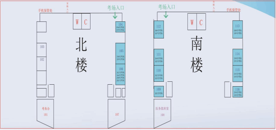 4号教学楼分南北楼考场存放手机,进入安检后为封闭区域,请考生提前确认所在考场位置并规划入场路线。本校考生建议不携带手机进入考点。